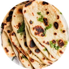 Naan, Plain Paan, Garlic Naan, Coriander Chilli Naan, Footlong Naan, Kulcha: Aloo, Onion.